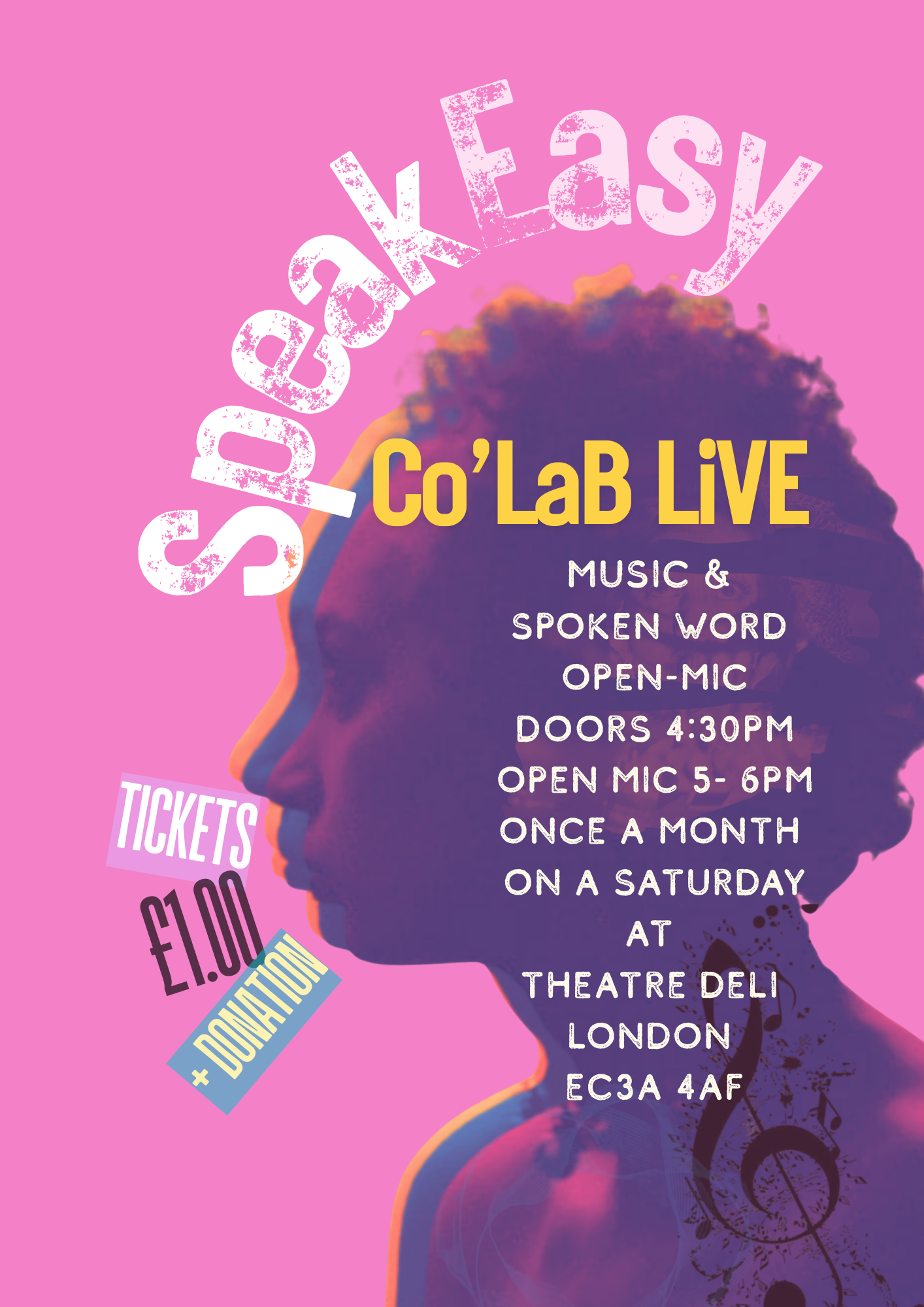SpeakEasy Co’LaB LiVE is the sister event to SpeakEasy Po’JaM, our bi-monthly Black & Global Majority music and spoken word night at Theatre Deli, London.